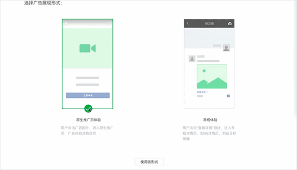 19tea朋友圈广告示意 除了上文提到的视频组件、卡券组件之外,广告主还可在自定义原生推广页中自由添加应用下载、公众号关注、外部链接、翻页效果等多个组件,感受功能和体验的双重升级。 自定义原生推广页使用小贴士 第一步:创建广告,完成广告计划设置与投放设置。 第二步:在创意设置页面,选择使用“沉浸式体验”。 第三步:选择“自定义原生推广页”,进入配置页面。