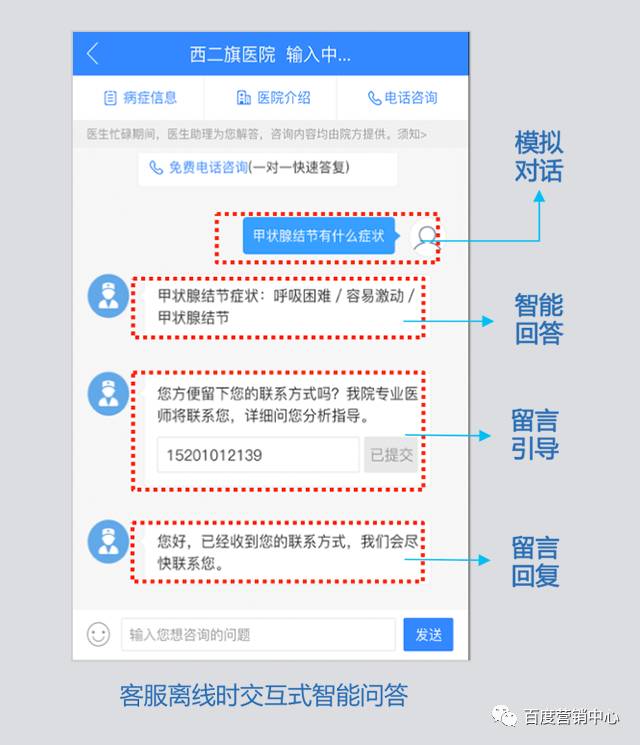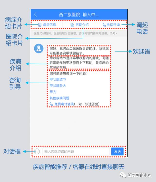 百度凤巢数据显示在过去6个月中,网民对“在线咨询”的喜好提升迅速,越来越多的商户将在线咨询作为主要的服务承接方式,对线索通也提出了更高的服务对接要求。2017年夏季,线索通对咨询组件进行大规模升级,力图通过行业解决方案的形式,帮助客户大幅提高“有效咨询量”。接下来,就为大家提供一篇关于有效提高“医疗行业“咨询量的定制解决方案。 医疗行业咨询现状 对于用户而言,搜索推广传统模式的咨询服务主要存在的三大问题:落地页信息内容繁多,与用户搜索词、创意割裂,相关性体验差;咨询页缺乏有效产品、服务信息,一味要求获取网民信息,造成信任度低,跳出率高;咨询页内容堆砌,与用户意图不符,咨询体验差。 对于客户而言,传统的咨询服务模式主要有以下问题:【展现→点击→网站→点击咨询插件→在线沟通】转化路径长,用户流失大;客服接待时,不了解网民意图,客服接待成本高;如客服离线,造成用户流失,转化成本高。 为更好地满足患者咨询服务诉求,提升医疗行业客户有效咨询量,线索通特别推出【智能咨询页】医疗行业定制解决方案! 方案详情 强强联合—— 亮点一:线索通意图识别模型,根据客户设定,精准扑捉咨询意图强的流量; 亮点二:【导诊助理】专享样式——结构化呈现创意,相关性更强,咨询达成率更高; 亮点三:与在线咨询行业龙头机构合作,共同打造【智能咨询页】——解决咨询路径长、客服接待成本高,缺失历史聊天记录等诸多核心痛点问题。 【智能咨询页】医疗行业解决方案:通过搜索结果页与咨询页联动,打造搜索结构页到落地页的一体化搜索流程,交互式引导+智能回答,提升网民体验和广告主转化。 有没有很心动。想不想立即使用?效果怎么样?有没有案例? 容小编详细说来——举个栗子! 当网民A在搜索医疗相关问题“北京内分泌科哪家医院好?”时。 首先,线索通的意图模型会根据网民的历史搜索与行为表达等因素,对本次咨询达成几率进行模型预估,达成咨询激励高的流程尽力争抢——【意图识别模型】