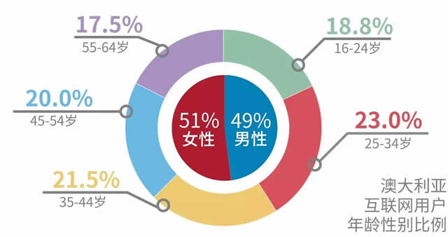 与曾介绍过的新兴市场不同,澳大利亚的网络市场并没有被划分为某个年龄段的主场,而是每个年龄段的网民分布都很平均,这也就意味着,针对不同性别和每个年龄段的商品,都有十分好的开拓前景。