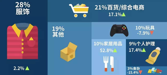 此外,澳大利亚网民平均每天上网将近5小时,其中大部分时间用在了社交媒体和观看视频上。YouTube是绝大部分网民最爱的视频平台,其中有63%的人是通过手机端观看。 Google 小贴士 在云云人海中找到自己的目标客户,除了可以选择通过 AdWords 地理位置设定以及Google的用户匹配,别忘了YouTube也是非常合适推广的平台,可以帮助你更全面的覆盖广泛的潜在消费者。 摸透了澳大利亚网民的特点,那你知道他们最爱买什么吗? 跨境剁手党,爱玩更爱美 玩具和服饰是澳大利亚网民跨境购买的主要商品类型。截止2016年,这两类分别占跨境零售总额的10.3%和28.5%。与去年相比,服饰品类海购保持增长趋势;而玩具海购虽比上一年有所下滑,但仍是海购比例高于境内购买的商品种类。 除此之外,澳大利亚消费者也越来越喜欢跨境购买家居用品以及个人护理产品。相较2015年,家居用品类的海购增长趋势走向非常明显,增长幅度52.8%高居所有商品种类榜首,个人护理类增长17.4%次之,市场前景非常可观。