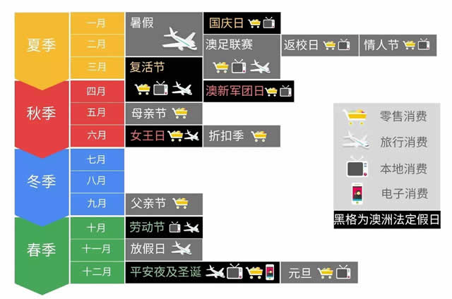 Google 小贴士 当地市场移动端渗透率极高,移动端推广方式不容忽视。因此,提高移动端的网页加载速度就变得尤为重要。时间就是金钱,不要让别人抢先一步。此外,无论在任何国家或地区,“接地气”都是拉近距离的方式,所以,如果想更亲近澳大利亚网民,网页的显示也要更亲民,比如首选澳式英语拼法、当地货币或俗语。 反季节营销 通过调查发现,澳大利丰田召回门危机公关策划亚消费者的购买行为很大程度受到季节、天气和假期的影响。在每年的2月返校季、4月复活节和12月圣诞节、新年假期均是消费旺季。此外,因为地处南半球,澳大利亚的季节与我们北半球相反,接下来进入春季,服饰换季即将到来。相关品类的跨境电商们,线上营销还要早早做好规划和打算哦。