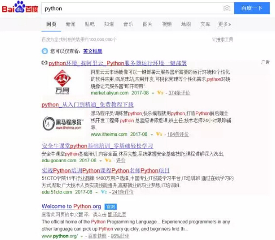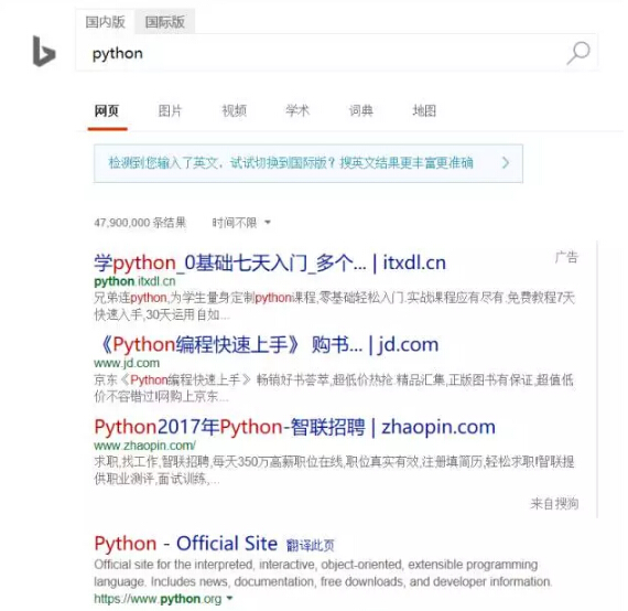 如今谷歌被墙了,天涯也不景气了,百度在国内搜索界可谓是巨头级别的了!自从百度出现魏则西事件以后,大家对百度的态度有了大转变哈,我也不例外,其实最主要的还是百度的这个推广实在是人恶心了!所以我就果断使用了bing。下面我们就来比较一下吧!用图来说明一下吧! 一、作为安全人员使用Sqlmap需要安装python环境,我们搜索一下吧!