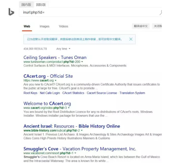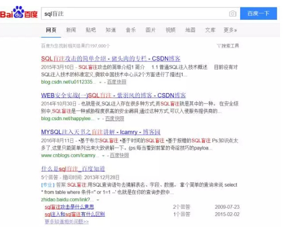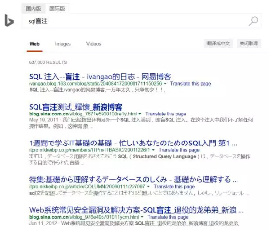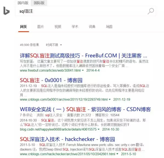 完美支持,而且还都是国外网站,你懂的哈!从这个搜索结果可以很明显的感觉到,国际版搜索出来的大多都是一些外国网站,对于国内的某些技术资源支持怎么样呢? 三、以sql盲注为例,先看国内版