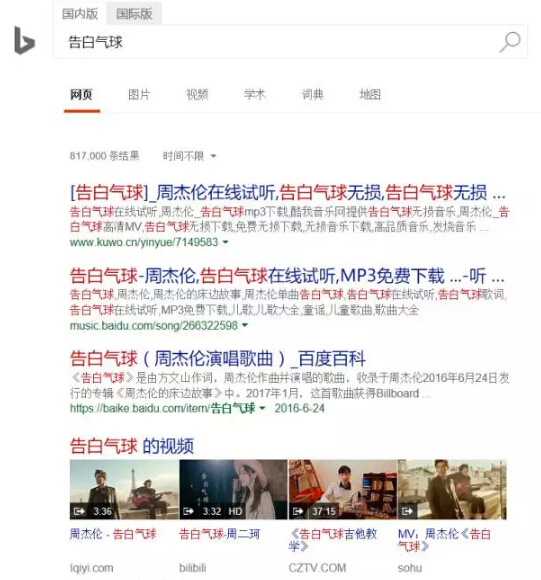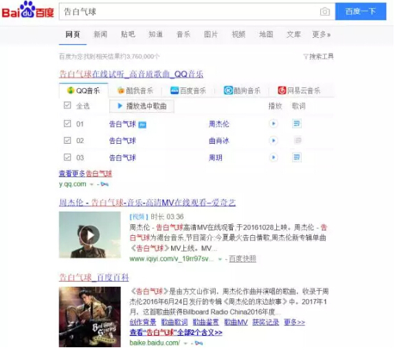 这个国内版bing和百度的对比我们就需要看自己的想法比较了,我还是认为bing的比较好!百度貌似被我扁地一无是处了,百度老总会不会来打我!剩下的篇幅主要就是赞扬一下百度了,百度作为国内搜索引擎,怎么能单单的从这个一个小的方面就将其否定呢!技术研究不是生活的全部,娱乐同样是我们的需求,所以我来比较一下影音方面! 首先 ----- 音乐 《告白气球》 a.百度