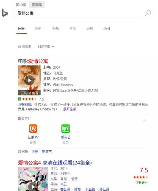 这个对比就很明显了,百度还是优于Bing,从影音方面综合来看:百度对于国内资源的搜索确实比Bing好! 这回要整体的总结一下了:在技术文章,国际版Bing在国外资源的搜索上面可以说是很优秀,对于国内资源可以使用国内版BIng,对于影音还是百度较好。从界面友好上来看Bing要更有心地多!可以看出微软在中国市场下了很大功夫!