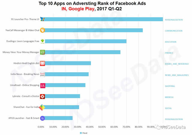 近两年,中国移动应用出海的进程不断加快。基于互联网渗透率的迅猛增长和人口红利的爆发,印尼和印度都成为了中国移动出海的必争之地。 从印尼2017上半年Facebook广告排行榜中我们可以发现,除了挪威Opera浏览器和由韩国SK Planet与印尼第二大电信运营商XL Axiata联合推出的开放性电商平台Elevenia外,其余80%的上榜应用均为中国出海应用或由中国企业参投。例如北京新美互通的Kika Keyboard、百度旗下的HiClub、YY的直播应用BIGO LIVE、和分别由五洲万象和阿里巴巴发行的新闻资讯类应用Baca和UC News。 排在印尼首位的Akulaku是一家主打海外市场的分期购物电商平台,专为南亚和东南亚用户提供消费金融服务,产品主要针对印尼、菲律宾、马来西亚等市场。很多人以为Akulaku是印尼本土电商平台,但其实Akulaku也是中国出海应用之一,由深圳街角(SILVRR)推出发行。 此外,近日新获3.5亿美元融资(京东参投)的东南亚在线旅游Traveloka也进入了印尼榜单进十。算上这轮融资,Traveloka在过去一年里的融资总额已经达到了5亿美元,相信新一轮的融资会让Traveloka继续加大在移动社交平台的广告预算,预计下半年的排名将保持增长趋势。 印度