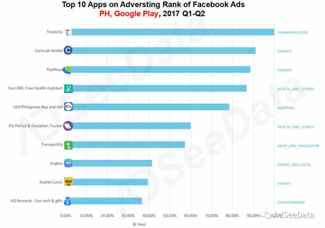 数据显示,2017上半年东南亚地区电商购物类应用移动广告花费持续上涨,在Facebook移动广告经济中占主导性地位,上榜率高达18.3%。与此同时,与电商相辅相成的财务金融应用也进入快速发展阶段。 由于东南亚地区银行业发展相对缓慢,营业网点不足,只有极少数人能获得银行服务;又因为手机的普及率远远领先银行的渗透率,银行业的滞后和快速发展的移动互联网需求相碰撞,这种局面自然刺激了许多财务金融应用的出现。其中,菲律宾和泰国是该地域移动金融经济最为领先的国家。 其次,社交和生活类应用在东南亚应用市场同样占有非常高的市场份额,两者上榜率同为8.3%。 以下为2017上半年东南亚各国Facebook广告移动应用Top 10及其应用类别: 印度尼西亚