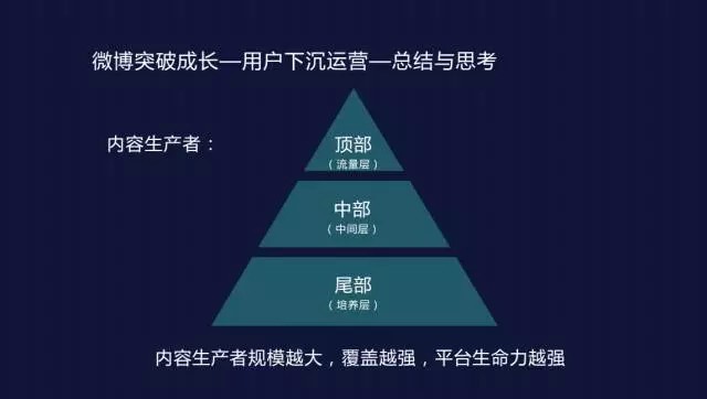 现在大家都在提“红利期”。我觉得红利期就是一个恶魔。 所有人都认为,红利期过了,就什么都干不了了。但真正的问题是,平台的快速成长期过后,你要做什么。 你需要做的是好好去思考你的产品到底是什么。坚持和定位非常重要——如果你徘徊来、徘徊去,时间窗口就过去了。 微博在这阶段看清了自己的产品定位:社交媒体。我们只做社交媒体,不做社交通讯。 正是因为我们想清楚了这一点,才有了微博从2015年开始的彻底反转。这不是大家想象的“突然有一天就又火了”,而是我们做了大量的工作。 我们回过头来做一个总结和思考。 微博作为一个内容消费社区,它的消费形态是,少部分人贡献内容或服务,大部分人消费内容/服务和产生互动。 对于这种形态来说,对内容生产者的运营,其实是最核心的部分。 我将内容生产者分了三层:顶部、中部、尾部。