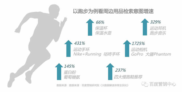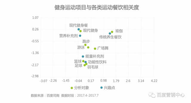 运动餐饮:走进科学的身体管理 体外有重重科技保护,体内同样需要配合运动进行科学管理。“七分靠吃、三分靠练”是很多健身运动爱好者信奉的理念,“吃对”才能不辜负你运动场上的汗水。我们在主流运动项目与健身、健康食品的对应分析中发现,篮球、足球、羽毛球对功能性饮料(如红牛、脉动等)和能量补充剂(如能量胶、能量棒等)相对更为关注;现代健身人群对营养补充剂(如蛋白粉、肌酸等)和现代健身餐(如健身食谱、健身沙拉等)情有独钟,而瑜伽爱好者偏爱传统养生餐饮(如养生汤、瘦身粥等)。