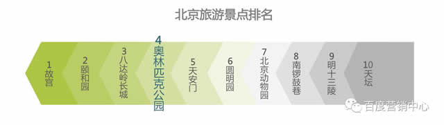 燃动全局:产业融合的无限想象 近日,国务院办公厅印发《关于进一步扩大旅游文化体育健康养老教育培训等领域消费的意见》,将体育与文化、旅游间的“跨界”提出要求。而这其中提到的体育旅游其实早已融入大众的生活——我们将体育运动旅游分成参观体验型(参观体育景观或体验体育项目)与竞赛参与型两种。前者最典型的项目当属集鸟巢、水立方等著名地标于一身的奥林匹克公园,在国家旅游局与国家体育总局今年认定的体育旅游示范基地中,奥林匹克公园作为背景地区的示范基地而上榜。百度意图大数据显示,奥林匹克公园的检索量已经位居北京旅游景点检索排行的第四位。