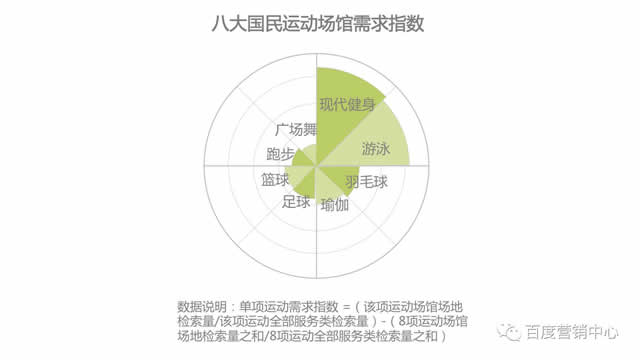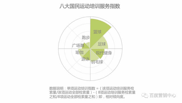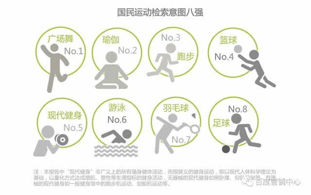 2009年,为了纪念北京成功举办奥运会,也为了倡导人民群众更广泛地参加体育健身运动,国务院将每年的8月8日定为“全民健身日”。在全民健身日8周年之际,清数大数据产业联盟(原清华大数据产业联合会)与百度携手,开展全民健身运动工作坊,并基于工作坊的讨论以及百度意图大数据的研究,共同制作了这份全民健身运动报告。希望通过对大众健身运动中“大众参与型”运动(即不包含赛事内容等纯观赏消费型)的观察,为大家呈现这个正在燃起的朝阳产业中的关键特征。 数据来源: 如无特殊标注,本报告所有数据均来自百度意图大数据,具体分析工具包括百度指数、百度司南、百度探星、百度关键词规划师等。 数据时段: 如无特殊标注,本报告检索量数据时段均为2016年全年,增速类数据均为2017H1相比于2016H1的同比增长。 全民健身运动燃点榜 我们从网民检索意图角度出发,总结了主流大众健身运动的几个不同维度数据特征。仅以此榜,分享给热爱体育运动的朋友以及大众健身运动产业从业者,供您在进行品类选择、地域布局、节奏规划等商业决策过程中辅助参考。 燃点排行:八大国民运动概览