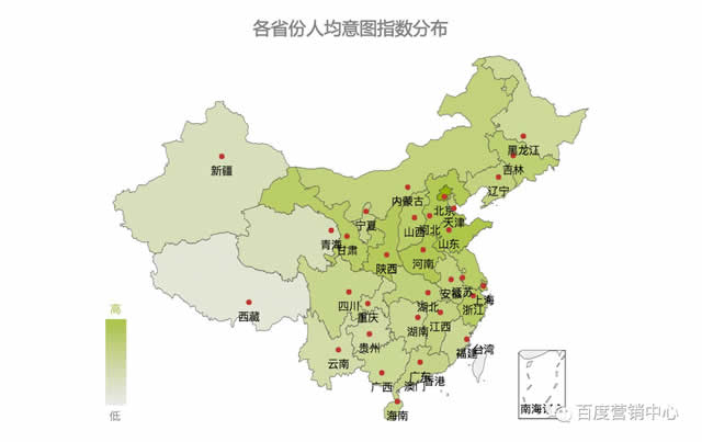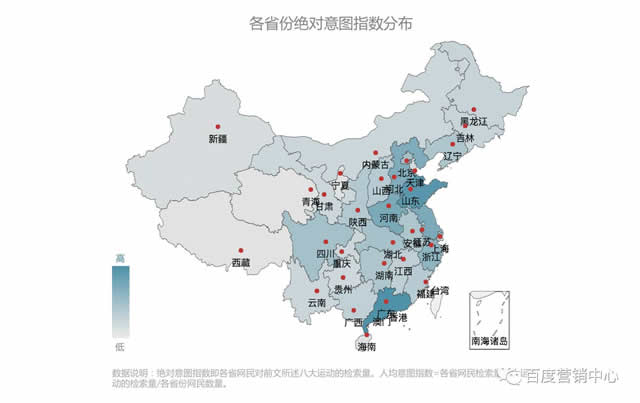 地域燃点:国民健身运动区域分布概览 从绝对意图指数上看,广东、山东等网民大省当仁不让;而在人均意图指数上,一线城市跃升明显:北京从前一项指标的第9名上升至第一名,上海从第16名上升至第6名;而河南、河北、浙江等几个省份无论从绝对指数还是人均指数上看,都保持在前10名的位置。