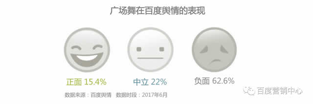 公共场地:指标在落地中微调升级 在产业集中的场地服务另一端,是我们不得不提的是公共运动场地。以对公共场地依赖度较高的国民第一运动广场舞为例,近年来一直饱受非议。百度舆情2017年6月的舆情情感分析显示,高达62.5%的网络舆情为负面倾向,负面新闻主要集中在场地争端,《广场舞大爷围殴篮球青年,因球场冲突警方介入》等场地冲突新闻标题映入眼帘。