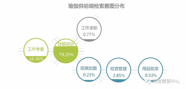 场地冲突的一个显性现实是公共运动场地紧张。政府部门近年也正在不断为其设定更具体的服务目标,甚至各级政府会在能力范围内,偶尔微调目标,尽量做到更好,以福建省为例:在2016年6月国务院印发《全民健身计划(2016—2020年)》中,国务院提出“城市社区15分钟健身圈,人均体育场地面积达到1.8平方米”;而2016年10月福建省人民政府印发的《福建省全民健身实施计划(2016—2020年)》中,“15分钟体育健身圈”保持不变,人均体育场地面积目标设定为“达到2平方米”;2017年1月,在福州市人民政府印发的《福州市全民健身实施计划(2016-2020年)》中,提出了“人均场地面积达到2.05平方米…城市社区建成10分钟体育健身圈”。 培训市场创业:轻型职业技能受追捧 运动教育培训是大健身产业中不可缺少的一环,专业的指导不但能规避运动伤害的风险,更能让运动效果事半功倍。如前文提到,很多“搅局”者就是通过精品教学策略来解决传统健身馆业态的痛点,切割市场份额。而对于实施培训的各类运动教练而言,对专业场馆环境、设备需求度越低,其创业的门槛就越低。以瑜伽培训行业为例,在用户需求端,虽然相比于其他运动项目而言,其培训服务指数指标仅排名第六名,但在在供给端,其供给端需求指数排名升至第四名——瑜伽创业甚至都不需要像前文提到的小型健身场馆一样采购少量推胸机、划船机等重型器械,只需一个干净明亮的空间,配以瑜伽垫、瑜伽吊带等轻量器材,一位瑜伽教练即可踏上创业之路。或许也正因如此,当我们详细拆解瑜伽供给端检索需求的细分意图分布时,发现高达16.36%的需求是关于“工作考量”,即询问职业前景类信息,而高达79.25%的检索意图是在在寻求瑜伽教练培训学校、瑜伽教练认证等信息。