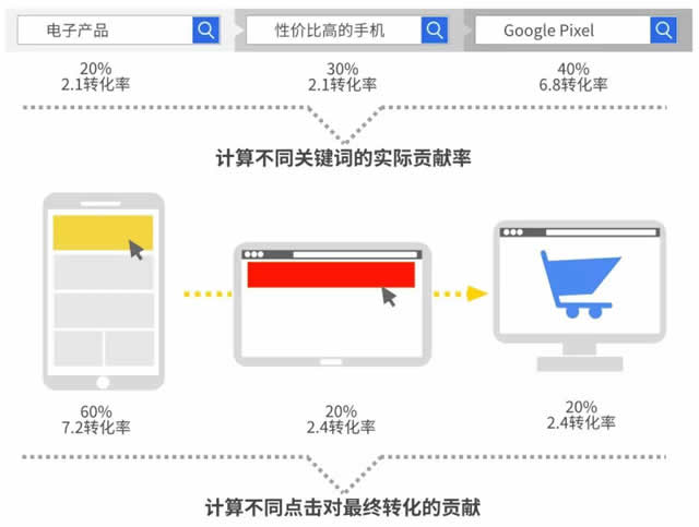 困境二 前几年,用户只通过单一设备完成搜索、浏览、下单等操作,也很容易算出该渠道所带来的转换率。而随着设备逐渐增多,客户在各种设备之间的切换也更随心所欲。因此,对于分辨各渠道所贡献的客群量和他们的转化率就变得越来越难。有些营销党还发现,多屏营销虽然可以扩大覆盖目标客群的范围,但是如果针对不感兴趣的用户重复投入,就造成了推广浪费。 Google自2016年起就把数据驱动归因模型(Data-Driven Attribution/ DDA)引入AdWords。这套模型依据机器学习技术,可以帮助营销人辨别消费者决策路径中的不同点击对最终转化的贡献,并将跨设备的点击贡献进行归因。传统的“最终点击归因模型” Last Click,由于只记入最终点击和最终点击设备的功劳,忽略了消费者转化路径中之前的所有动作,一不精确,二浪费了大量有效数据,三对于跨设备的行为只有追踪不计入归因贡献。当消费者在手机端进行了大量搜索调查,最终在电脑上成单时,最终点击归因模型只会给电脑归因,而数据驱动归因模型也会给手机端记上功劳。这样结合智能出价,可以更好的提高各个设备的转化效果。