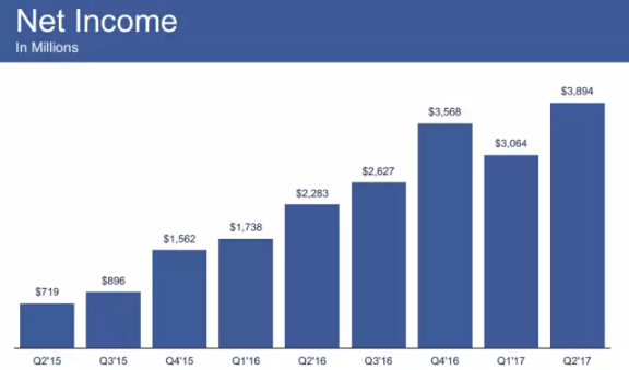 Facebook过去几个季度一再预告,受广告投放空间濒临上限的影响,广告增长动力可能会减弱,但就第二季的财报来看,Facebook还是交出一张漂亮的成绩单,包括月活跃用户数增长17%突破20亿人,以及营收增长45%达93亿美元,而净利更大幅增长71%至38.94亿美元的新高。