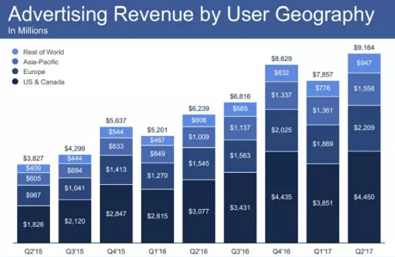 Facebook第二季度营收变化 而就区域表现来看,广告收入也呈现全面增长态势,当中以其他地区增长56%为最高,其次依序是亚太区增长54%、北美增长45%、欧洲增长43%。整体来看,第二季Facebook广告平均价格增长了24%。