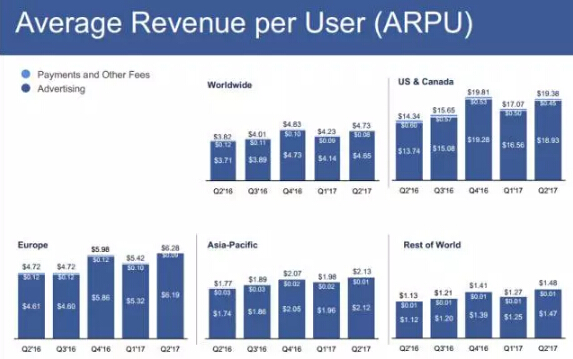 Facebook第二季度区域ARPU变化 另外Facebook营运长Sheryl Sandberg宣布,Facebook目前的企业用户数已经突破七千万家,Instagram也超过1500万家。