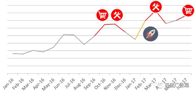 洗碗机行业搜索量2017年上半年整体同比,快速上升,实现108%+的增长。越来越多的用户想要一台洗碗机,哦,不!是一台家庭争端终结机,解放记几的双手,来一盘王者农药吧,扫除“饭后谁洗碗”的世纪家庭难题,一举多得! 洗碗机市场容量的成倍增长,对于洗碗机品牌而言绝对是利好的消息;其中Mobile端搜索洗碗机相关关键词的用户在2017年上半年占到了60%左右,相对于2016年上半年PC和Mobile端,不相上下的态势,移动端已逐渐成为,洗碗机品类搜索行为的主要来源,品牌的营销预算应该更多地向移动端倾斜。 201601-201706洗碗机行业整体月度搜索趋势