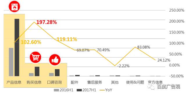 2017年上半年洗碗机行业82.43%的搜索量,来自于通用词,17.57%的搜索量来自于品牌词,同比2016年上半年品牌词占比略有上升,但变化不大,用户主要靠搜索通用产品属性,来获得消费决策信息,信息品牌层面的认知度还有很大的提升空间,需要品牌增加市场声量,提升品牌认可度。 2017H1 VS 2016H1洗碗机行业关键词属性搜索份额&搜索量变化趋势
