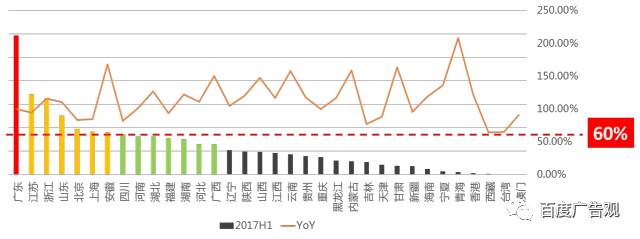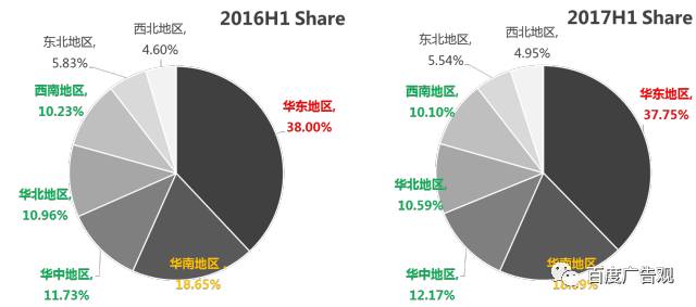 2017年上半年方太凭借创新高颜值水槽洗碗机牢牢占据头把交椅,西门子、美的和海尔处于腰部位置,均表现出极快的搜索量增长态势,可以预见未来两年将是洗碗机品牌圈占市场的黄金期,品牌必须在新品研发和市场声量多战线发力,愉快地抢占蓝海市场。 4- 洗碗机搜索区域市场解析 2017年H1 洗碗机行业搜索份额大区域分布 & 同比变化情况 2017年上半年华东地区成为洗碗机产品搜索量地区,其次是华南地区,是洗碗机第二大区域市场,华中、华北、华南也有不小的市场空间;2017年上半年全国各大区域洗碗机搜索份额变化不大,各区域市场增长均衡,洗碗机市场全国普遍增长。 2017年H1 洗碗机行业搜索量省级区域分布 & 同比变化情况 2017年上半年洗碗机产品在广东地区的搜索关注量最高,什么都吃的美食爱好者广东人民排第一位不意外!热爱烹饪的广东人民毫不犹豫地将洗碗问题交给洗碗机;沿海其它发达的省市也是洗碗机搜索的热区,拥有庞大市场需求;同时2017年上半年各省市搜索量增幅都在60%以上;全国洗碗机市场普遍看涨。 2017年H1 洗碗机行业搜索份额城市规模分布 & 同比变化情况 2017年上半年不同级别规模城市对于洗碗机搜索的需求份额同比变化上看,三四线城市的搜索需求份额有明显的增幅,相对于一线城市的成长度有明显提升;洗碗机搜索需求主要来自于庞大的二、三、四线城市;未来品牌营销的策略应该更加注重区域的下沉,重点在二、三、四线城市的 产品教育和品牌传播,一线城市用户对于洗碗机产品认知度及保有量方面走在前面,一线城市的营销活动更侧重于销售转化层面。 5- 洗碗机搜索用户兴趣解析 洗碗机搜索用户一级兴趣偏好示意 (20170508-20170805)