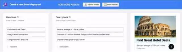 智能型展示广告系列自动制作了 25000 多个版本的 trivago 广告,并展示给 55 个国家/地区搜索酒店特惠信息的用户。 依托Google强大的机器学习技术,智能型展示广告系列会自动完成以下工作: 利用来自数百万应用和网站的深入分析信息,将商家与可能对产品感兴趣的潜在客户联系在一起; 制作适合在 Google 展示广告网络中任意位置投放的精美图片广告、原生广告和文字广告; 根据广告主的效果目标设置适合的出价。