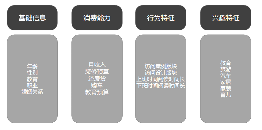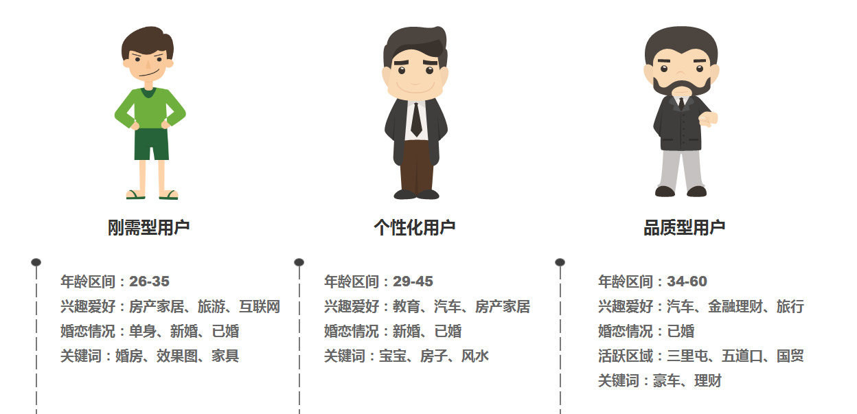二、了解产品有哪些受众 通过收集的用户标签及对用户的理解,就可尝试搭建用户画像了,根据不同类型的用户,选择不同的受众定向,在做推广前,我会问自己三个问题 用户:分别有哪几类用户,会对产品感兴趣? 场景:用户分别活跃在在什么场景,有什么行为特征。 需求:产品可以满足该类型用户哪些需求,和现有的解决方案对比怎么样? 以家装行业为类,我把受众分为以下三个类别