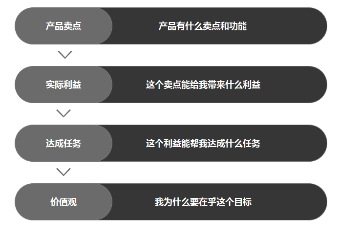 举个栗子: 比如公司产品有个卖点是“免费设计”,那么这个卖点能带来什么结果?其中一个就是“不花钱就能看到装修后的样子”,再往下联想客户想通过“看到家装修后的样子”达成什么目标呢?其中一个可能是“通过设计让家变更美”,那为什么让家变更美会是一个对客户很重要的目标呢?因为用户的价值观是“努力奋斗的自己,一定要住好一些”