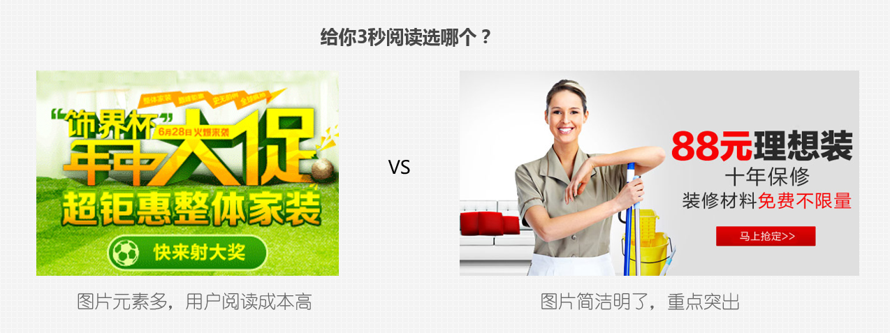 1-3 傻瓜都要在3秒内看懂的图片创意 KISS原则——傻瓜都能在3秒内看懂 信息流广告展示环境相对复杂环境,在众多信息轰炸下,用户注意力十分分散,因此,我们广告要让用户能在第一时间了解到广告所所传递的信息,挑选最有价值的卖点,必须用最简洁的设计方式呈现,让用户在3秒内即可明白产品的核心价值。