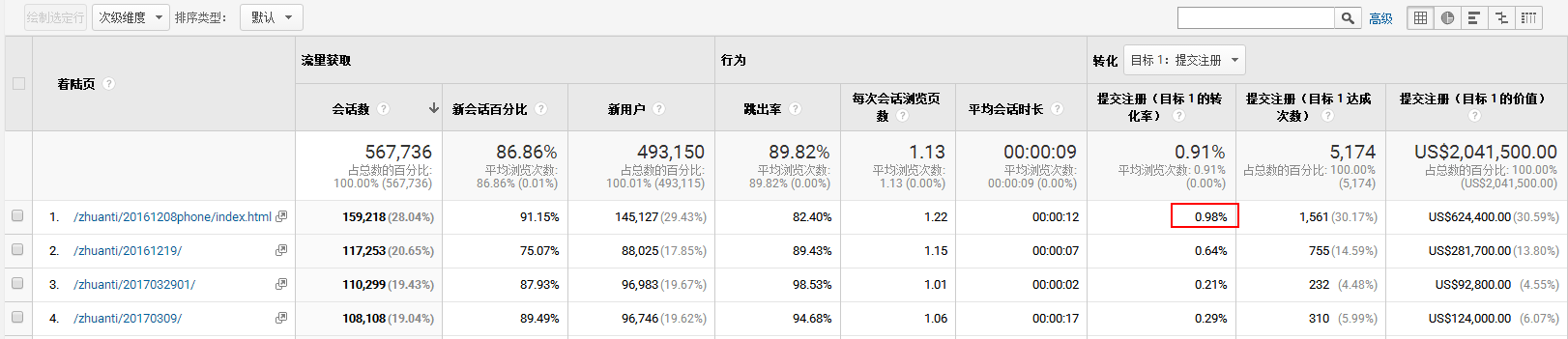 四、钱花了,怎么才能判断推广效果的好坏? 白花花的的银子流出以后,让推广人员真正睡不着的时候才刚刚开始,最近几个月装修旺季,半夜也总是睡不安稳,生怕钱花出去后没有效果。半夜都起身看看账户,没什么异常才去睡回笼觉。 以下分享几个常用的数据分析方法 一、观察转化率趋势变化 1.总体趋势变化 把GA目标代码部署到注册按钮后,便能很方便的每天观察转化率变化趋势,如果转化率有异常的情况下下,便开始复盘寻找原因。