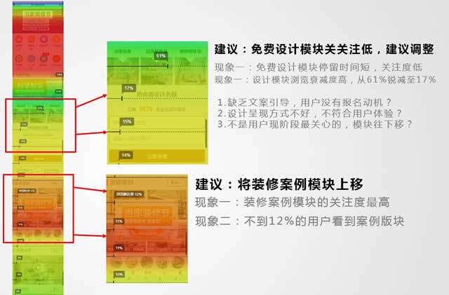 三、热力图监测 但在大流量引入的情况下,还需要对页面转化率进行微迭代,哪怕只要提升0.5%的转化率,都可能直接节省好几十万的推广费用,我选择利用ptengine进行热力图监测,比如这个页面,用户在浏览到第二屏便从61%流失剩下17%了,客户为什么会如此快速的流失,是否因为过早引入转化板块,引起用户反感?用户停留时间最长的两个板块分别是头图和设计案例板块,是否可以考虑把用户关心的内容往上移?带着这个假设进行调整,便可对页面进行微迭代,把假设得以验证。