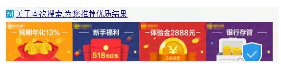 点评:该组图片风格统一,颜色对比强烈。和文字创意同时展现时,该组创意更能吸引网民关注。另外,一张图片对应一个落地页,可有效分流潜在用户,转化效果也能得到一定提升。 (某金融客户)图秀对于我们的品牌宣传和网站流量的导入均起到了提升作用,同时转化效果也得到了增长。由于这个样式形态比较新颖、醒目,所以从测试期间我们就参与了尝试投放,图秀展现的概率大,效果挺不错,对于我们的用户吸引力也更大。 展现截图: