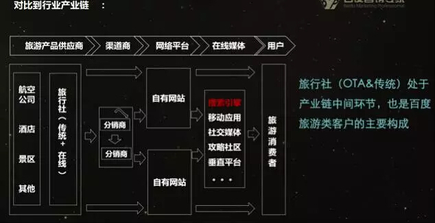 把这一个行业单独拿出来看,头部100的客户在行业收入占比,不到1%的客户,大概是139个旅游行业的客户,贡献了行业80%的收入,这也应证上面所说的行业收入过于集中、行业寡头效应明显。其他行业可能符合二八法则,也就是20%的客户贡献80%的收入,这样是比较健康的,但旅游行业完全不符合。 贡献80%收入的这些客户的类型:除了大家熟知的一些在线旅行社,其余大多是酒店集团,以及航空公司。 把旅游客户进行一下分类,我们认为的传统旅行社和在线旅行社其实并没有明显界限,因为大家都在线上获客,区别在于主要的业务重心是在线上还是线下。业务重心在线下部分的旅行社,他们的收入降比比行业整体降比更多 。 这个降幅数据和行业整体降幅做对比,其实我们业务重心在线上的这一部分的企业,它的降幅没有那么高,只不过业务重心在线下的这部分降幅很高,带来行业整体10个点左右的降幅。 第二部分 :对比到产业链 对比到行业产业链:旅行社类客户(传统+在线)是百度旅游类客户的主要构成,但很难说它们是收入的主要构成。