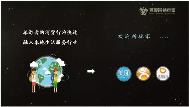 在线购买景区门票这部分用户的消费行为,某种意义上等于自由行用户线下消费行为。团体旅游,门票、住宿会是打包产品的主要构成,基本不会涉及到线上购票。在自由行的各个方向的消费占比中,住宿占比没有想的那么高,而餐饮购物大概可以占到百分之六七十。餐饮和购物其实在我们的概念上是属于本地生活服务领域。现在我们自由行用户消费趋势显示出他们消费行为跟本地人在本地消费没有什么区别,反映的一个趋势是自由行用户它的消费行为在变,其实就是旅游异地生活本地化趋势。 3、本地生活服务领域的玩家进入这个行业其实本质上源于消费者的消费行为的变化。 旅游消费者的消费行为变成了跟本地人在本地的消费行为没有什么区别,它在融入本地生活服务行业。这一个变化也就为美团和大众点评、滴滴出行等本地生活服务行业新玩家进入这个行业铺垫了背景。 4、未来很长一段时间内酒店跟OTA的竞合关系 。 传统的搜索流量大部分导入到OTA,酒店需要提升自营比例,需要跟OTA抢夺流量,这是竞争的一面。合作的一面,短时间内,酒店不可能脱离OTA,OTA目前仍是酒店客源构成最重的一块。所以未来酒店和OTA,应该是一个长期竞合的关系,包括航空公司与OTA,也是这样一个长期竞合的关系。 5、航空公司、大型酒店集团未来在百度的投入很可能会持续增加,中小酒店会更加依赖OTA。