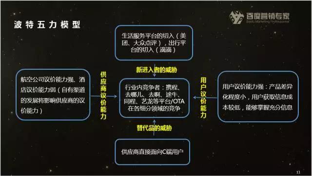 从产业链上游来看,分成以下几个板块:大交通,大住宿,大旅游,以及其他(包括小交通,签证,WIFI等服务)。 【交通方面】航空公司要提升直销比例,对流量上的投入只有能增长 。航空公司2016年的直销比例,各航空公司的公开数据是东航大概40%,南航是40% ...这个和国资委要求直销比例仍有差距(而且这个数据还是有一定的水分,估计这个数值至天津影视广告公司少10个点水分。) 【住宿方面】大型酒店集团的直销比例会逐渐提升,而中小单体酒店则会更依赖0TA 。住宿业务中的非标准住宿方向,目前市场极不规范 。对于标准住宿而言,大的酒店集团提升直销比例的基础上可以去跟OTA争夺话语权,而对小酒店来说,他们跟OTA的话语权争夺上就处于一个绝对弱势的地位。 从用户检索行为看需求。从2015年10月到2017年3月,整体趋势来看年度有20%的增长率。 词包的构成剔除掉了直接指向OTA的品牌词,主要构成是指向酒店品牌词、住宿信息、住宿攻略,这部分的检索数据反映的用户住宿需求并没有指向OTA,所以连锁酒店在流量上是可以和OTA竞争的. 单体酒店未来对OTA仍然是一个强依赖关系,他们很难去跟OTA争夺话语,也可能会越来越依赖OTA。 【景区方面】目的地和景区其实很难界定,旅游是带动性强的产业,游客只要到达目的地/景区,在当地会产生餐饮,住宿,购物需求。这些餐饮,购物,住宿需求带动当地服务性行业的整体发展。另外,中国90%以上的景区处于体制内,可能是以管委会、国有旅游企业等形式, 处于体制内的这部分景区在大谈特谈全域旅游的大环境下,以开放形式存在的景区将越来越多 。 第三部分 :从波特五力模型来看这个行业变化