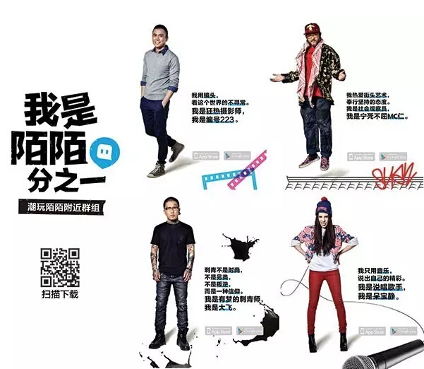 同时推出《陌生并不存在》系列海报,通过对族群和圈层的不同诉求,吸引更多人来陌陌找志同道合的人,成为拓展人脉的手段。