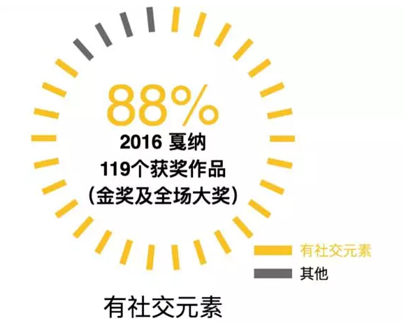 2016年戛纳国际创意节的获奖数据显示,88%的获奖作品含有社交元素,其中的66.7%与社交平台高度相关。