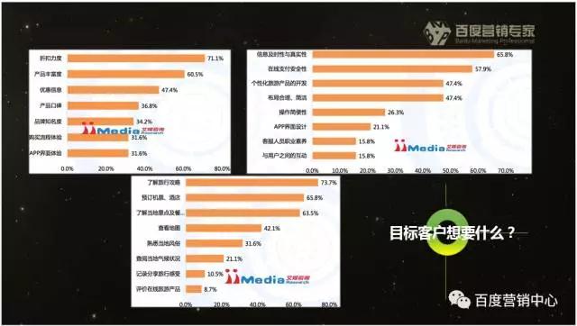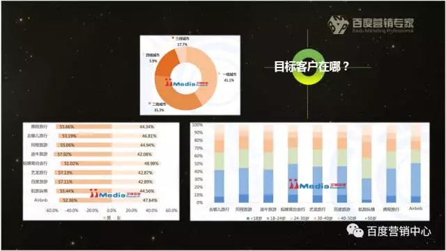 讲师介绍:黄杰:百度业务运营部 高级产品市场经理 展示广告经历3个阶段 【媒体购买】第一阶段:碎片化购买+人工排期。谈媒体,直接买。到2005、6年。 【受众购买】第二阶段:精准定向+人工排期。2005、6年开始,到2012年,利用cookie来分析,广告主关心的是买我广告的人是不是我的目标。当一个客户要投北京、男性、喜欢汽车的目标用户,即通过精准定向的方式,开展投放。但是也遇到一些问题:数据无法衡量,无法获得认可。尽管大家知道它的优势。但每年媒体价格是上涨的状态,赢利趋缓。 【程序化购买】第三阶段:智能、自动进行投放。使得所有媒体都可以为我所用。目前我们就在此阶段里。 百度在广告主和网民中间,利用MDSP需求方平台,进行多维计算,匹配广告和网民之间的最高价值点,将最合适的广告精准匹配给最合适人。 一、旅游行业背景解读 首先在线旅游行业的行业挑战和破局机会并存 1、挑战方面 巨头挤占市场,业内竞争激烈--去哪儿旅行主要推特价; 同城旅游,主要做攻略;途牛主做会员产品和用户互动,各大巨头争相挤占市场份额等; 产业链复杂,竞争主体非常多,竞争差异化,立体化--旅游行业上游产品供应商、中间代理商及下游平台复杂; 目标客户捕捉难度大--下游媒体和平台,可以直接影响客户。 2、机会方面 国家的政策已经放宽,对旅游行业的扶持利好; 线旅游行业的新兴力量带来新的营销契机; 旅游逐渐发展成为大众生活方式。 3、现状 旅游人群,50%以上的人旅游决策前受外界环境影响,在旅游前没有想好目的地,之后收集信息,了解攻略,查看他人评论,随之进入决策周期,最后,旅游人群最终去的地方,和他最开始目标地方不同,这意味着我们有充足机会影响目标客户,所以这时候就是程序化展示广告可以发力的地方。 二、旅游人群特征分析 目标人群特征分布:主要集中在一、二线城市(占率超过70%);男性比女性略高(平均男55%,女45%),年龄段分布中,18-24岁占比最高,其次是24-30岁的人群。