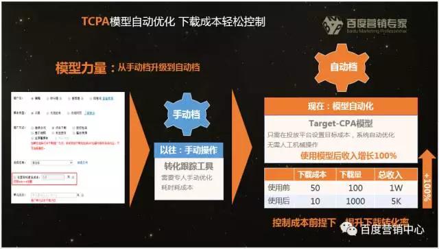 线上的视频广告,同时结合公交车上的聚屏广告以及家庭的智能电视广告;覆盖出行、休闲等碎片化时间。 2、APP推广 APP的营销,一般包括在线交易,信息搜寻,产品的预订,活动通知,优惠信息推送等几方面。TCPA的模型,MDSP推荐一款基于APP下载、激活所进行的智能优化的方式;一般来说,APP大小在5M-10M时下载成本,安卓系统一般5-8元,APP越大付出的下载成本越高。 TCPA这个功能怎么用?在后台进行设置目标激活成本,然后不断的让百度的大数据进行计算、目标人群筛选投放,系统完成APP下载、激活等数据的获得,直至达成我们对APP推广成本心理预期;