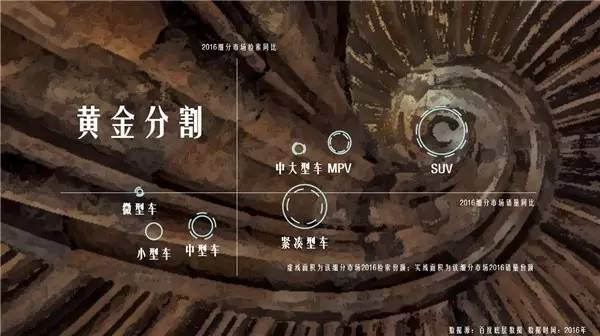 黄金分割 2016年,处在暴风眼位置的SUV市场,检索同比和销量同比双高。而其他细分市场,完美的散落在符合黄金分割系数的螺旋曲线的中部和尾部。图中SUV市场的虚线面积(检索份额)大于实线面积(销量份额),说明需求份额大于成交份额,该市场还有渗透潜力,较多需求仍待转化,类似的还有中大型车和中型车市场。相反,紧凑型车和MPV市场相对饱和。
