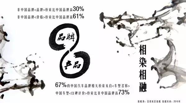相染相融 中国画和西方美学不一样,最讲究意境,乌黑的墨溶进透明的水里晕染开来,看似对立的事物达成了统一,和谐。就好像营销学的经典课题—品牌和产品。外国品牌的用户更频繁的检索品牌和价格(价格反映品牌溢价),而中国品牌的用户更关注车型和口碑(口碑直接对应车型)。从检索内容的偏好看出中国品牌和外国品牌正处在不同阶段。品牌出众提升产品溢价,产品出色拔高品牌上限,往复循环,相互影响。品牌和产品本就是一体,相染相融。