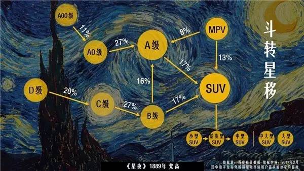 斗转星移 和我们通常印象中的星空不同,梵高的星空饱含浓烈的情绪,风云变幻,斗转星移。汽车市场也不是一成不变的,各市场间存在着激烈的竞争和抢夺关系。A级车和SUV市场对其他各细分市场均有用户抢夺作用;轿车市场的抢夺作用主要进化为两条路线,A00级到A0级到A级,由小到大,D级到C级到B级,由大到小,用户在选车的过程中不断了解自己的真实购车需求,不断靠近自己真实的购车极限。