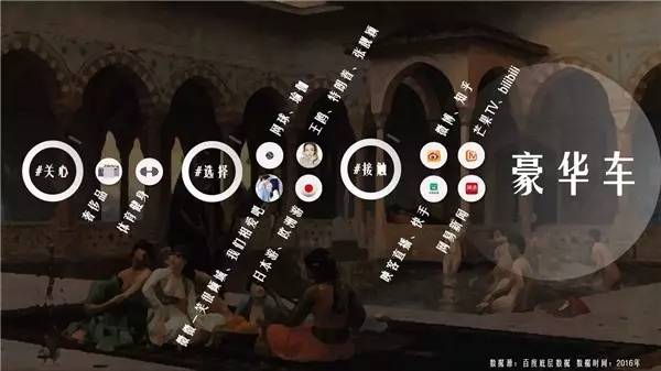 豪华车人群:有闲阶级,重视可被感知的价值,渴望分享和肯定 关心:增加自身外显价值的内容和途径 选择:高消费运动、八卦娱乐明星、爱情主题剧集、购物游 接触:娱乐明星社交APP、年轻化娱乐视频APP、分享型短视频直播APP、评论型资讯APP 背景画:阿拉伯王宫女眷的聊天“浴乐”时光