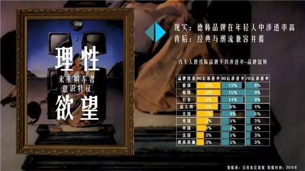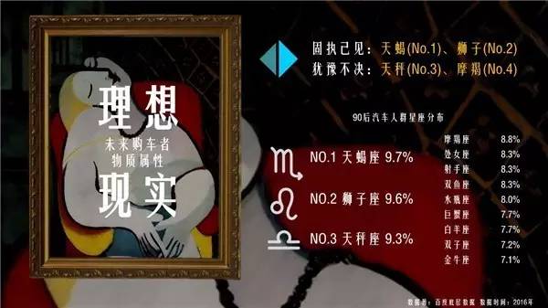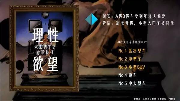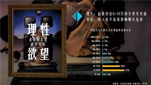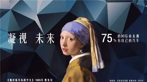 PART3:绘•来日《绘眼独具,画心解数》 对于画家来说,未来存在于戴珍珠耳环的少女清澈透明的双眸中,对于汽车从业者来说,未来就在消费者眼中。未来的消费者怎么想,未来就是什么样。经过百度数据的测绘,75%的90后尚未拥有自己的汽车,而他们将在未来的5到8年内,迅速成长为汽车市场的绝对购买主力。来了解一下90后潜在购车者的物理属性和意识属性: