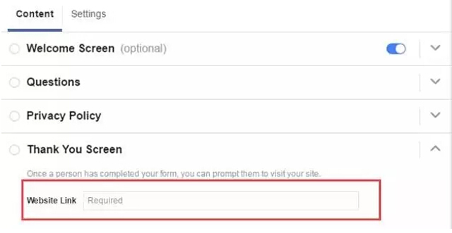 表单设置界面在广告层级,点击线索表单版块的 + 新表单即可新建线索表单,共由四个部分组成:欢迎页面(资料卡)、表单问题、隐私条款和感谢页面;其中除了Questions之外的其他3个部分都是可选项。