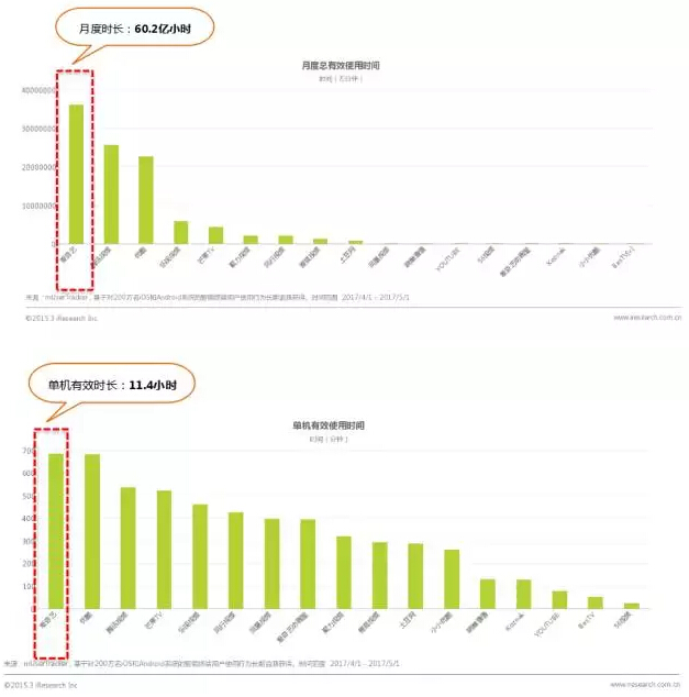 除此之外,移动端月度观看时长爱奇艺APP也以60.2亿小时稳居第一。