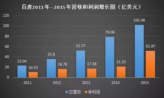 百度营收及净利润以实现自2011年至2015年连续5年的增长。