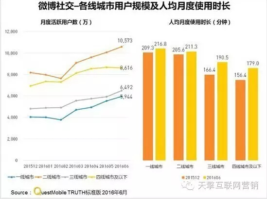 7月13日,专注于移动互联网研究的数据服务公司QuestMobile今日发布年中盘点报告指出,进入2016年微博社交在一线城市、二线城市、三线城市增长势头不减,城市涨幅接近50%,二线城市已经领跑,人均月度使用时长上,三四线城市的增长显著。