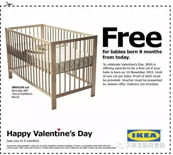 最闷骚 - 宜家 宜家七夕特别推出的广告:“婴儿床,免费!只限9个月后出生的孩子。”意思是说,情人节这天,你可以拿着出生证明和优惠券去领一张免费的床了。宜家此次的闷骚程度,杜蕾斯恐怕都要甘拜下风了。