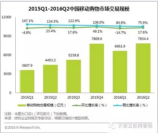 艾瑞咨询最新数据显示,2016Q2中国移动网购市场交易规模达7834.4亿元,同比增长75.9%。随着移动端占比的不断提升,移动端增长空间减小,导致移动网购交易规模增速有逐渐放缓的趋势。